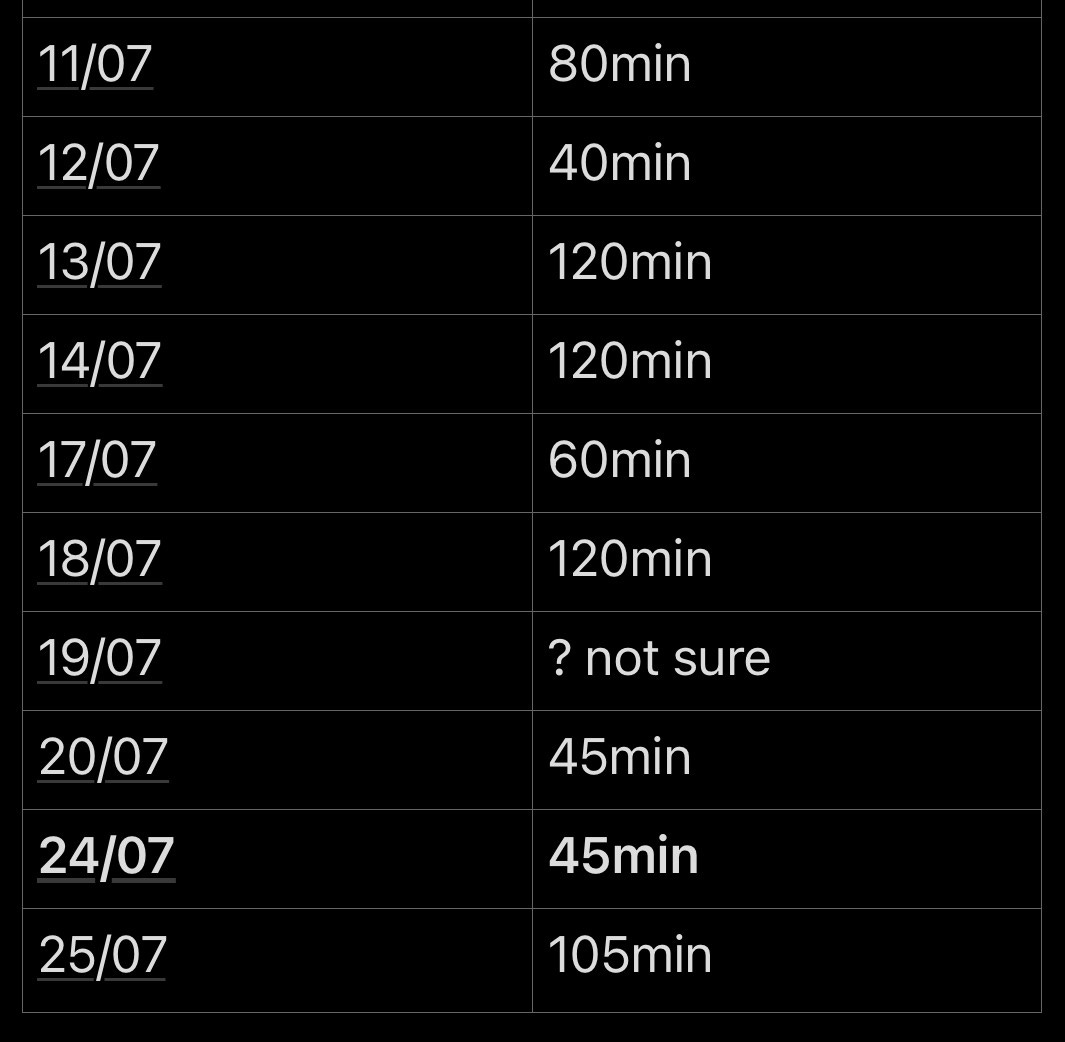 Putting everything together, this got me to 5x90mins = 450mins in two-week periods, or 900 minutes a month.
